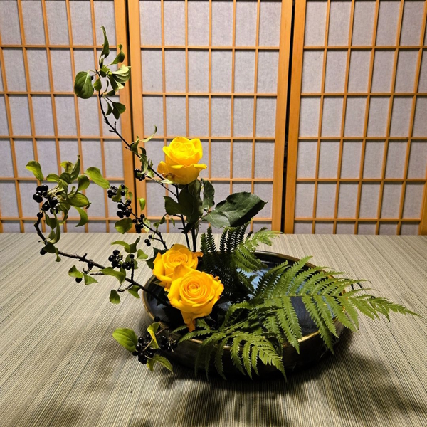 A Moribana Upright Style arrangement featuring backyard buckthorn, ferns, and bright yellow roses shows how seasonal materials can come together beautifully in Ohara ikebana.