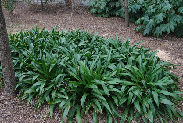 This slow-growing plant thrives in deep, dry shade, where many others would falter. Its tough, dark green leaves—sometimes variegated with white edging—grow in an elegant fan and can reach over a foot long. In warmer climates, the foliage remains green year-round. In colder regions, the leaves die back, but return with vigor in the spring.