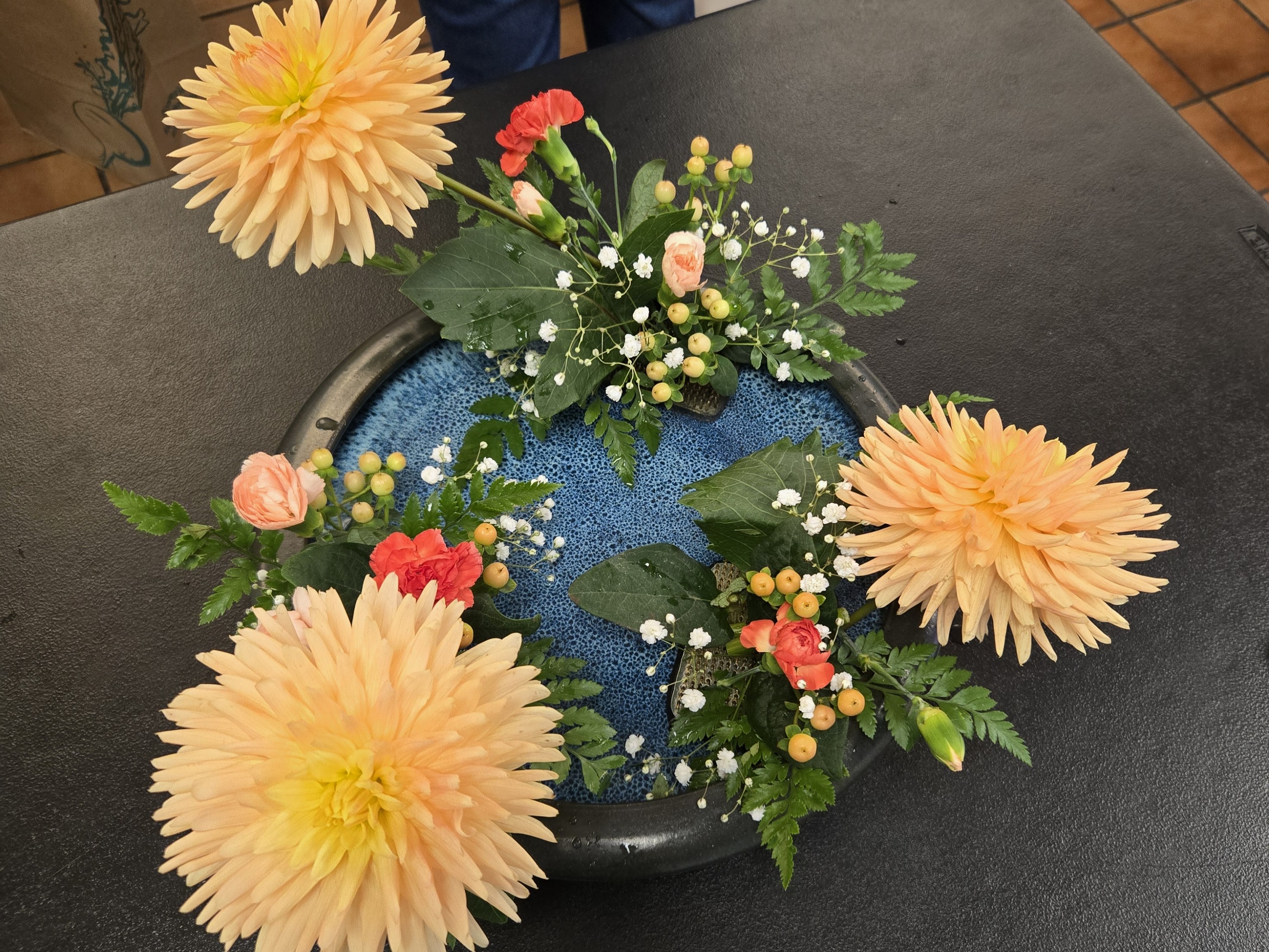 Our first lesson of the day was Circular Form (Mawaru Katachi). The principal stems were dazzling dahlias grown by Cynthia Druckenbroad in her own garden. They were absolutely spectacular—large, full, and brimming with late-summer energy.